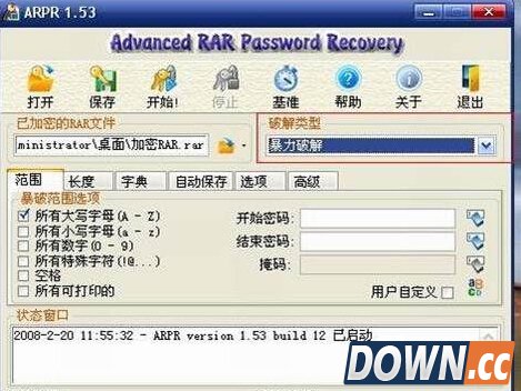 选中并打开该文件,选择暴破范围选项,破解类型选择。