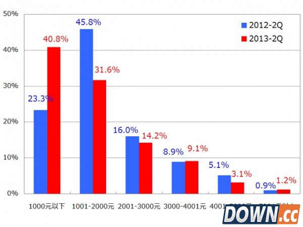 那么,2013年哪个价格段的智能机在中国卖的最好呢?根据EnfoDesk的调查报告,2012年第四季1000至2000元的“千元机”占了一半,接下来是千元以下的机型占了23.3%。2000元以下的机型加起来占了整体的七成,很显然千元机占据了中国智能机销售的中心。