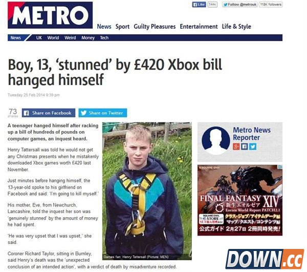 英国兰开夏郡的13岁英国少年亨利下载了约4200RMB的Xbox的收费游戏被家长责训斥“不给你圣诞礼物了”后上吊自杀。事件发生于去年11月,亨利不小心下载了相当于4200RMB的Xbox的游戏。母亲训斥他:“不给你圣诞礼物了”。之后亨利在自己的房间里上吊自杀。