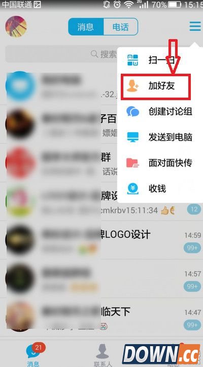 第一步:需要下载最新版的手机qq,下载安装后打开右上角剪头指着那个标志,选择加好友那一栏