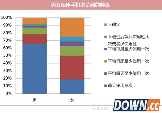 在手机浏览器的使用频率方面65%的男性每天多次使用手机浏览器,而女性中31%的用户表示平均每天使用一次,这说明男性使用频率更高,当然这也和男女使用手机的时长有关。
