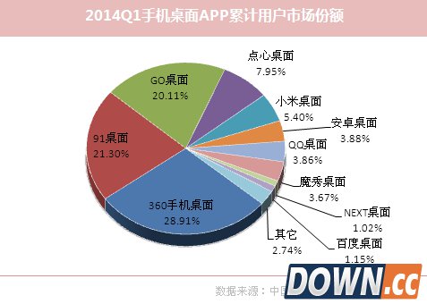 中国IT研究中心发布的《2014年Q1中国第三方手机桌面APP市场监测报告》显示,目前360手机桌面以28.93%的累计用户数市场份额排名首位,91桌面和GO桌面紧随其后。