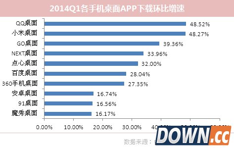 中国IT研究中心统计显示,在第一季度当中,手机桌面App类产品下载总体而言仍保持了较高增速。其中,基数较小的QQ桌面与小米桌面下载环比增速都超过了48%,魔秀桌面尽管最低但也达到16.17%。