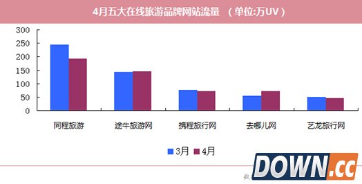 2014年4月中国软件资讯网针对携程旅行网、去哪儿网、同程旅游、途牛旅游网、艺龙旅行网五大国内在线旅游品牌的网络影响力进行了调查与研究。在网站访客方面,同程旅游和途牛旅游网超越“去携”,成为网站访问量最高的前两位在线旅游品牌,昔日去哪儿、携程两虎相争的局面已不复存在。数据显示,2014年4月,国内主流在线旅游品牌网站访问量排名依次是同程旅游、途牛旅游网、携程旅行网、去哪儿网、艺龙旅行网。其中访问量最高的同程旅游4月份月平均流量为192万UV,不过相较于3月环比下滑20.99%。而途牛旅游网4月份月平均访问量为145.2万UV,环比有所增长。