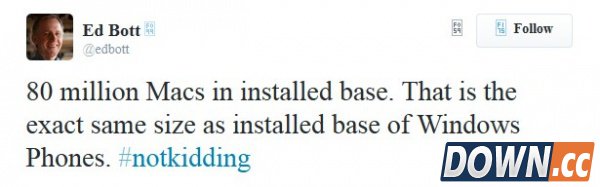 在今天的开发者大会上,苹果宣布自家Mac用户已经达到8000万台,并对微软Windows 8.1大肆奚落一番。不过现在,已有外媒记者替微软发声,称WP用户也已经突破8000万。外站记者Ed Bott郑重表示,微软WP用户已经突破8000万。