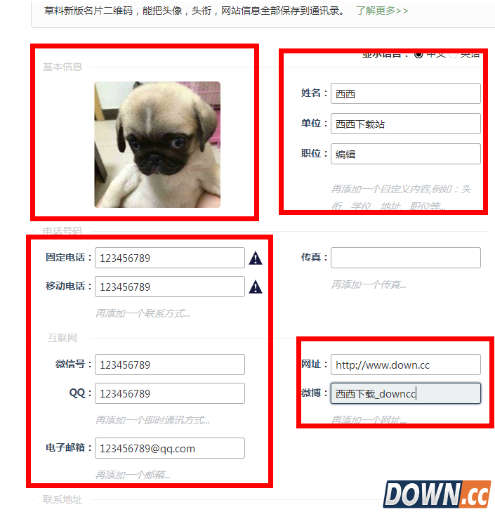 还可以添加头像,这似乎是该网站独有的功能,我试了下,可以在手机上非常完美的展现。并且可以同步保存到手机通讯录,效果非常的好。