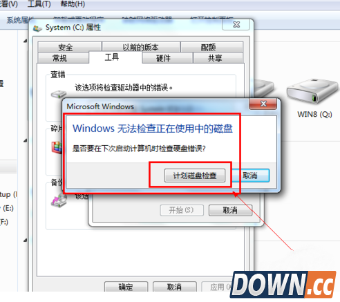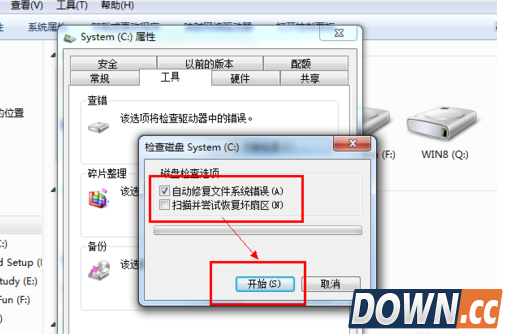 3、这是系统会弹出一个窗口,选择开始系统给就会开始扫描并开始修复磁盘中的错误,这个过程需要一段时间。