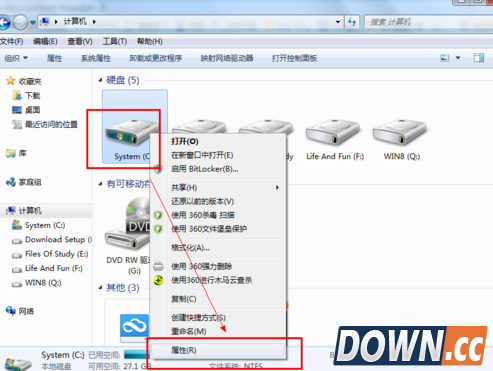 打开计算机——选中C盘后右击——选择属性。
