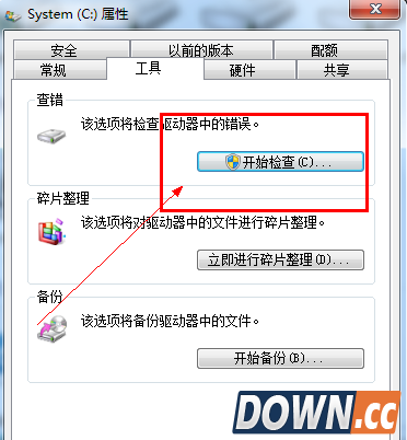 2、在属性面板的上面有一个工具选项,选择其中的查错——检索磁盘中的错误。
