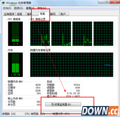 2、选择上面的性能选项——在面板的下方有一个资源监视器的按钮,单击进入你就可以全面查看你电脑目前的运行状况,那些软件偷偷占用你的内存一目了然。