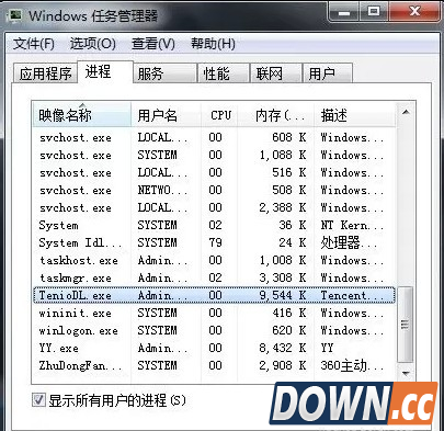 三、进入到任务管理器的“进程”选项,找到TenioDL进程并结束,就会达到实际网速的更新速度!