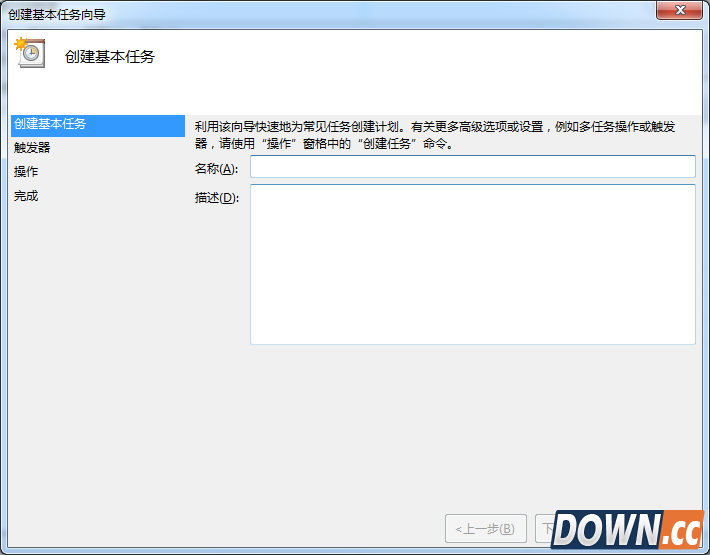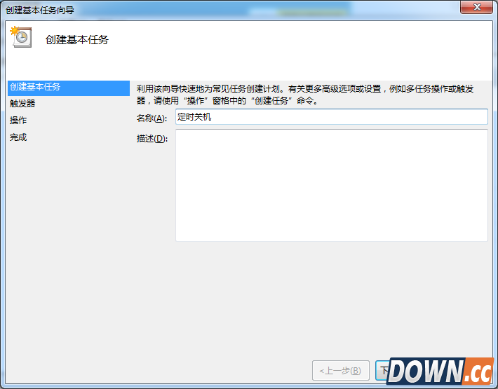 2、点击打开任务计划程序后,在最右边的操作框里选择创建基本任务,然后在创建基本任务对话框的名称一栏里填写“定时关机”,然后点击下一步。