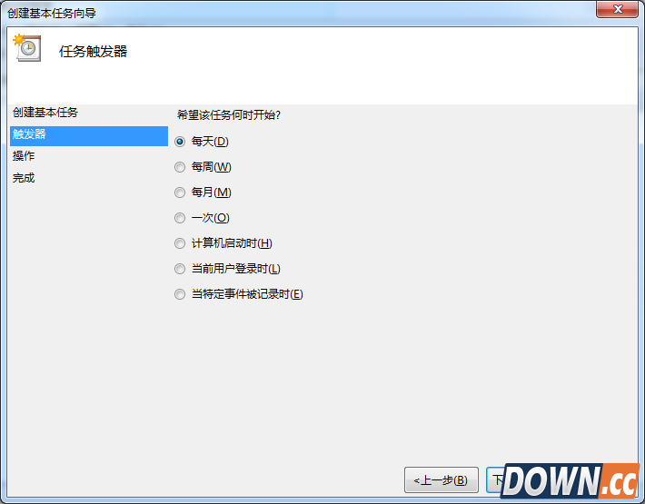3、在写完名称点击下一步后,会出现任务触发器对话框,你可以根据自己的需要选择定时关机的开始时间。举例来说如果选择每天,即每天都要定时关机;选择每周,即每周某一天或几天会定时关机,以此类推。选择好了点击下一步。这里小编选择每天。