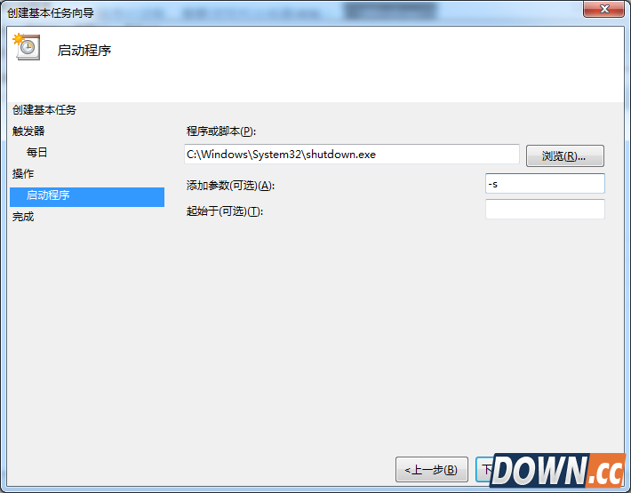 5、输完时间点击下一步,会出现启动程序对话框,需要浏览找出或直接输入 C:WindowsSystem32shutdown.exe 这个程序。在添加参数后面的框中输入 -s (即关机命令)