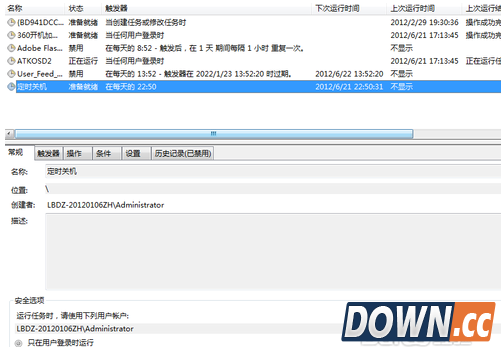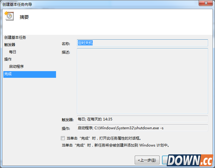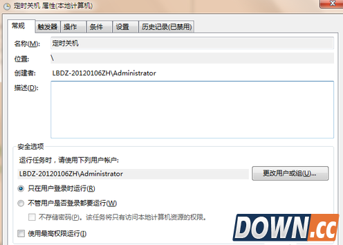 7、可以勾选摘要对话框最下面的“当单击完成时。。。。。。”,点击完成后会出现定时关机属性。在这里可以更改名称、位置、用户等。定时关机程序到这里基本设置完了。