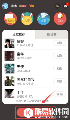 1、下载全民K歌并打开,首页如图所示,最下方有点歌按钮。安卓跟苹果是一样的,都是通过此按钮点歌。
