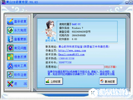 黄山IE修复专家是一款功能强大,好用的网络安全修复软件。反浏览器劫持病毒,超越IE修复极限,立足永久修复的治本之点。同时具备IE修复、杀QQ病毒、杀各种以服务方式运行的病毒、杀各类木马(无进程木马、插入线程木马)、清除各种间谍广告程序、各种流行病毒及系统救援与日志上报于一身,一套等于多套。修复易死灰复燃顽固性、古怪性恶意网页所破坏的不能完全彻底修复的IE,专门清除间隔一段时间自动弹出恶意网页、多开几次IE及重起系统后又会被反复篡改的不能从注册表、进程、服务、启动项等清除的、挥之不去、除之不尽的奇怪恶意代码;一次性根除在用户在打开文本文件、可执行文件、浏览器、我的电脑、驱动器等又会死灰复燃的关联性病毒。在修复时自动为系统建立备份快照,自动创建浏览器劫持日志供用户查看、分析。