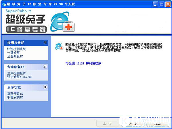 超级兔子IE修复专家能够快速、全面、一键修复IE浏览器和强力修复WinSock ,可能生成检查报告,并能一键重新安装IE浏览器。