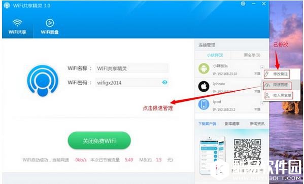 当智能设备连接热点后,可以对接入的设备进行“修改备注”、“限速管理”、“拉入黑名单”等设置。