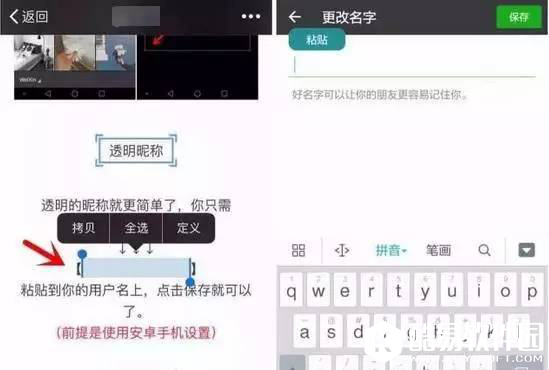 透明的昵称就更简单了,你只需复制括号中的文字,粘贴到你的用户名上,点击保存就可以了。如下图(前提是使用安卓手机设置)