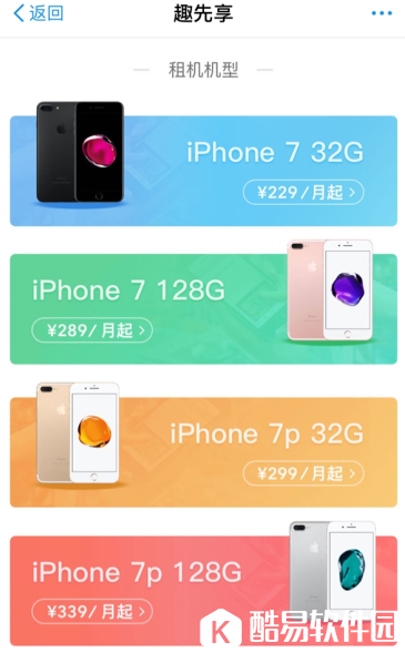 支付宝芝麻信用联合趣先享也推出了租机服务,机型很多,其中就有苹果iPhone,目前支付宝可提供苹果iPhone7 32GB/128GB、iPhone7 Plus 32GB/128GB四款机型可选,售价为229元/月起。