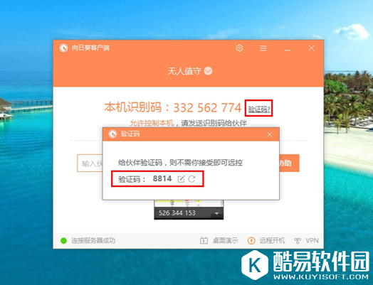 3、点击客户端上的“验证码”,可以看到4位数字的本机验证码。该验证码可以自定义输入,还可以随时切换其他的数字。如果你对远程访问你电脑的人比较放心,便可将此码和识别码一起发送给对方,对方就可以远程控制。