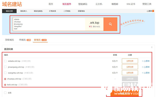 2、进入“域名建站”,在红框内输入自己喜欢的域名名称,点击查询,你自定义的以“.xrk.top”为后缀的葵域名名称会生成一个心愿单,立即注册就可以了。