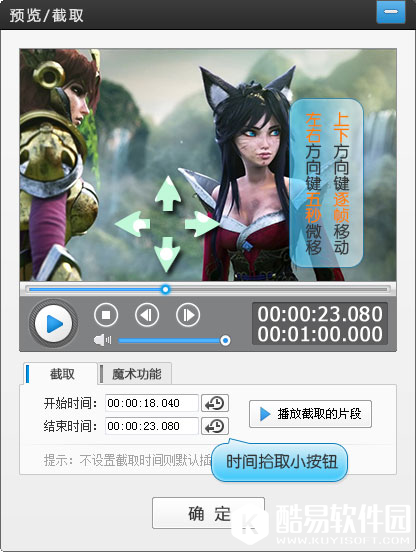 将视频导入爱剪辑,进入“预览/截取”对话框后,在该对话框选取片段开始时间和结束时间。为了精确踩点,我们可通过上下方向键逐帧截取,左右方向键5秒微移。