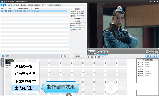 截取好视频片段后,在“已添加片段”区域的片段缩略图上,点击鼠标右键,在弹出的右键菜单选择“生成倒放副本”,即可实现倒带效果了。