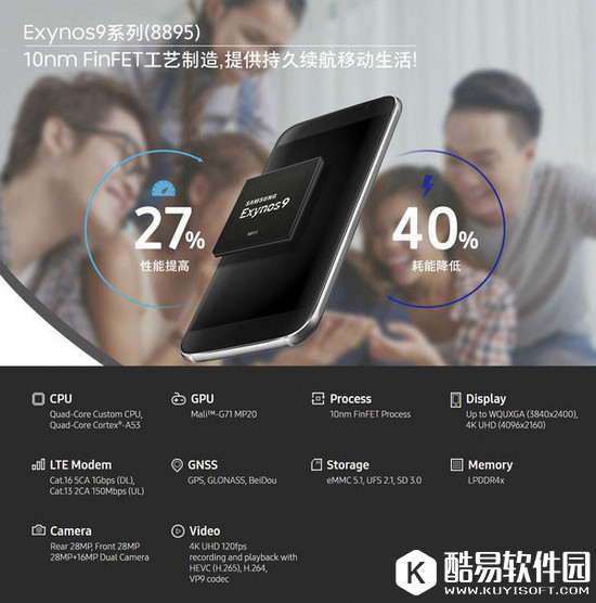 在国际版上面,三星Galaxy S8/S8+首发自家的Exynos 8895处理器,成为该机的又一亮点,其基于三星半导体10nm LPE工艺打造,相比14nm LPE性能提升27%、功耗降低40%,运行更流畅且提升续航能力。