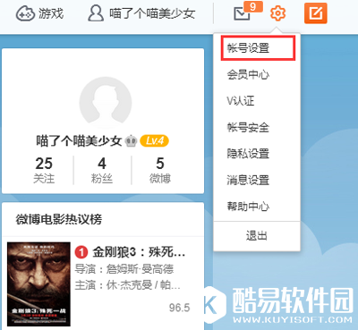1、打开网页版新浪微博,点击右上角齿轮,点击【账号设置】。