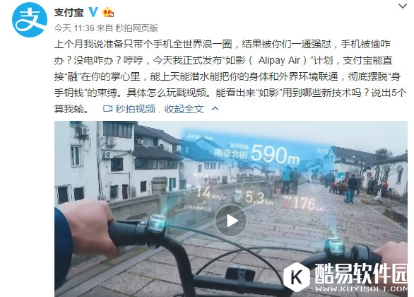 现在支付宝的功能是越来越多,各种高科技、黑科技也是层出不穷,继“空付”、“到位”、“蚂上”等黑科技后,支付宝宣布推出“Alipay Air”计划。根据这一计划,未来人们将不需要手机,就像好莱坞科幻大片一样,空气、水所有介质都能投射成支付宝,人和人的手指点一下就能支付。
