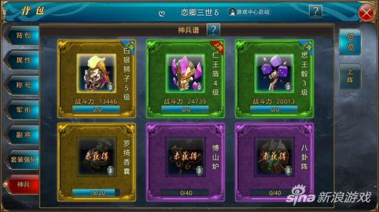 目前神兵分为:黄色、绿色、紫色三种。其中黄色为低级,绿色属于中级,而紫色则是提升战力最高的颜色。越高级的颜色,需要合成的条件也是不一样;白银狮子碎片和罗绮香囊合成需要20个相对应的碎片;仁王盾碎片和思王骰需要30个对应的碎片,而博山炉和八卦阵则需要40个碎片。当然,将军们不必心急,黄色的神兵碎片是很好获得的。
