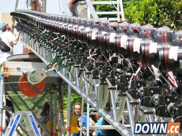 这些相机被装在一个长65英尺(约20米)的钢架上,拍摄前需要统一对焦和拍摄数据,最后通过电缆将他们连接在一起实现控制拍摄。