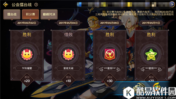 公会擂台战分“积分赛”和“巅峰对决”两个场次,积分赛是每周二和周四开启,我们的会长、副会长需要在周二19点前进行报名,活动开启时间是周二和周四20:00。历经两周为期4场的积分赛后才有机会进入巅峰对决。每场积分赛我们将会随机遇见一个公会进行比试,参赛方式需要玩家们进入公会擂台战的副本,然后点击左侧的“上阵”就可以了,比赛需要进行三场6人乱斗,三局两胜,获胜场会获得10积分,输了则没有积分。这里提醒各位小伙伴在参赛人员方面最好提前在公会群拟定好,不然大家一股脑的参加会出现阵容不合理等情况。