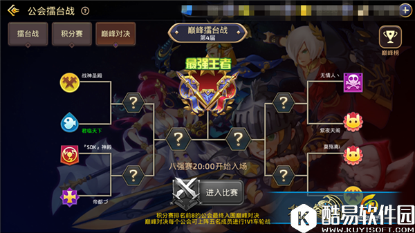 巅峰对决八强赛在当周周六晚20:00点开始入场,半决赛20:20入场,决赛20:40入场,每场比赛参战公会玩家有两分钟的入场时间,公会会长和副会长可以将尚未开始战斗的成员从上阵列表中移除。