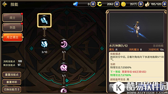 1,水月神舞——月主新技能水月神舞是一个高伤害高爆发技能,释放的时候迅速飞起,在空中快速斩击出5道剑气。现在的版本中,释放水月神舞的过程中可以空中翻滚。所以水月神舞对于月主来说,是一个PVE和PVP都很吃香的技能,他的即时释放,和随时可以取消都非常灵活,最主要是伤害也很高。冷却时间只有15秒,可以经常用在连招当中。