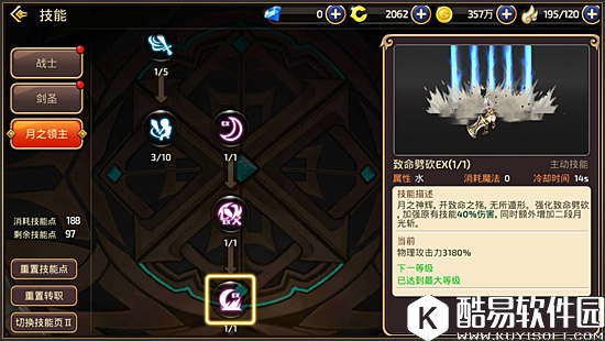 60级第三个EX技能:致命劈砍EX——致命劈砍原先是挥出三道剑气,持续移动对前方目标造成伤害,EX强化之后,变成了5道剑气,打出剑气之后再附带2段小剑气,伤害非常高,在PVE当中,如果boss体积较大,可以打全整个技能的伤害,CD也不长,非常的好用,基本属于必带的技能。