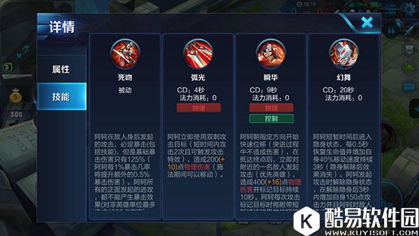 阿轲的被动是从敌人背后攻击会百分百出现暴击,暴击伤害只有125%,但是暴击伤害会随着暴击率提升,而从敌人正面攻击则不会产生暴击效果,被动限制了阿轲,如果想要打出爆炸伤害,一定要从敌人背后进攻;一技能是阿轲主要输出技能,释放技能时可以移动,很灵活;二技能是位移技能,可以追击敌人或者逃跑,也可以用二技能突进到敌人背后,利用被动打出爆炸伤害,标记敌人时还会减少敌人的输出,提高了阿轲的单挑能力;三技能是阿轲的核心技能,可以使阿轲进入隐身状态并增加移动速度和回复生命值,在解除隐身后3秒内还会增加自身攻击力,极大的增强了阿轲的秒人能力,并且阿轲对敌人造成伤害时增加自身移动速度,最厉害的是被动效果,击杀或助攻会刷新所有技能的冷却时间,可以让阿轲轻易完成收割。