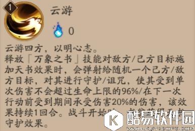 【云游】:被动,云游四方,以明心志。施放【万象之书】技能对敌方/己方目标施加天书效果时,会弹射给随机一个己方/敌方目标,对其进行守护/诅咒,使其受到单次伤害不会超过生命上限的96%/在下一次行动前受到期间承受伤害20%的伤害,该效果持续1回合。