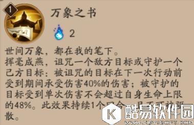 【万象之书】:2火,世间万象,都在我的笔下。挥毫成燕,诅咒一个敌方目标或守护一个己方目标:被诅咒的目标在下一次行动前受到期间承受伤害40%的伤害;被守护的目标受到单次伤害不会超过自身生命上限48%。此效果持续1个回合,且不可被驱散。