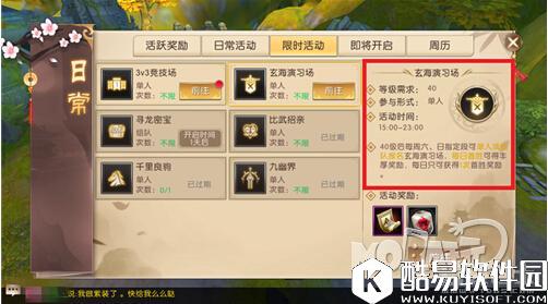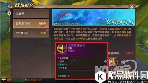 40级后每周六、日指定段可单人或组队报名【玄海演习场】,每日首胜可获得丰厚奖励,每日只可获得首胜奖励,20金票、灵酒(白)、银票5000。