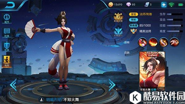 不知火舞二技能的伤害较高且有强力减速效果,在对抗时可以用二技能不断消耗敌人,并且依靠被动调整站位,当敌人的血量被消耗至一定程度时,不知火舞即可用一技能踢飞敌人并翻滚至敌后开三技能将敌人击退至人群,配上普攻触发被动再推一次+终结击杀对手。