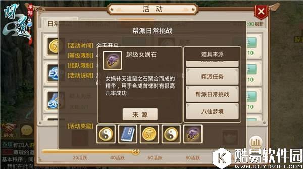 1、活跃度宝箱,活跃度80后获得的宝箱有几率获得超级女娲石。