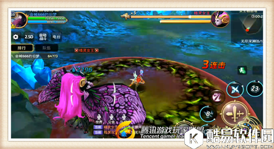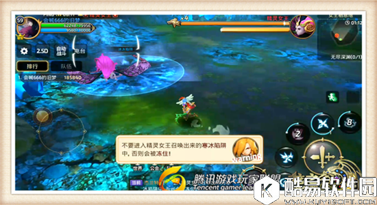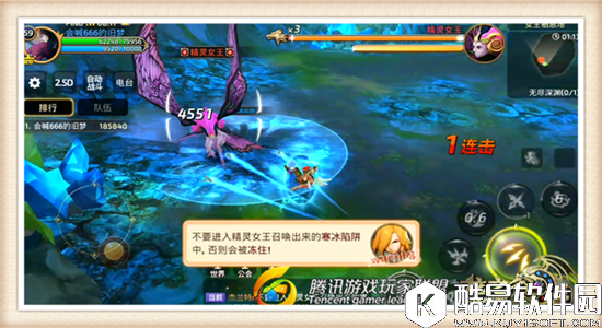 精灵女王Boss的血量在剩余一半后,自身的能力将会大幅度提升,小伙伴们将会面对更加严峻的挑战。上图所示的范围圈就是Boss的冰冻技能,小伙伴们一旦进入其冰冻范围,移动速度将会大幅度削弱,还会持续不断掉血,对我们的干扰效果极大。因此当看到蓝色区域的时候就要格外小心,尽量避免使用“刀锋疾驰”技能,预防误入到Boss的攻击范围中。