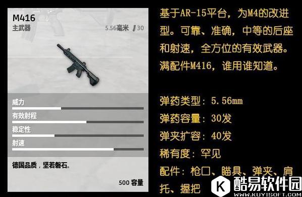 全配件支持下416还是很牛逼的,尤其是游戏后期 各种突发遭遇战情况,M416能胜任大部分距离的战斗,你常玩的话就知道 最后几圈的时候 换枪都是个挺危险的行为,所以M416的价值就体现出来了。