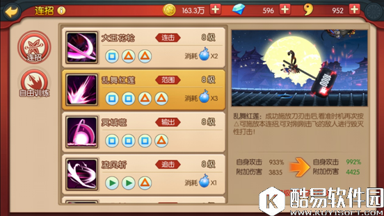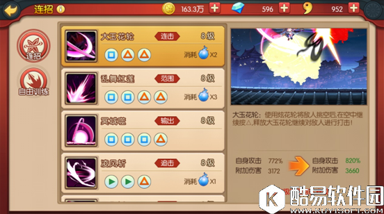 技能1:大玉花轮,将敌人挑空后在空中进行多段打击。消耗两点灵力。