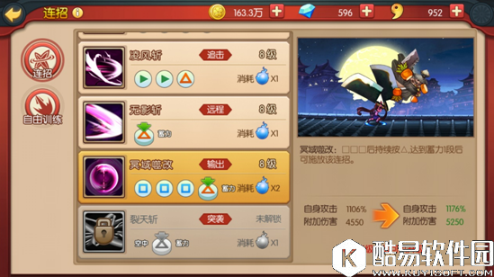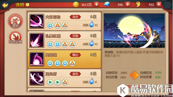 在连招的选择上如果喜欢连击的效果,尽量多的配合一些具有挑空技能,比冥域噬,□△这2个技能都可以让敌人浮空,而且不消耗灵力,可以连接其他技能,配合大玉花轮能达到无限连的效果。无限连要掌握好敌人被挑空后掉落的时间,把握好节奏再配合连招才能事半功倍。