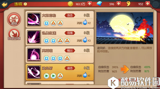 技能4:凌风斩,连续向前方冲击,造成伤害并对破甲有更大效用,消耗一点灵力。