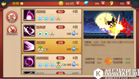 无影斩(△)是一个百搭的技能,后面可以搭配各种技能,比如大玉花轮(□△△),冥域噬(□□□△)都可以达到连击的效果。